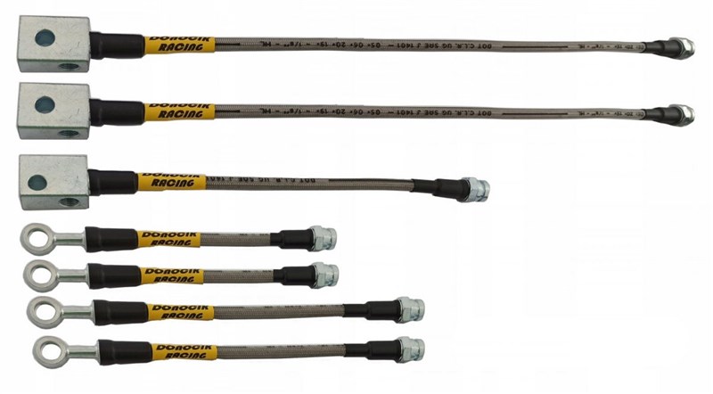Sada pružných brzdových hadic vyrobená na bázi teflonové hadice v ocelovém opletu.