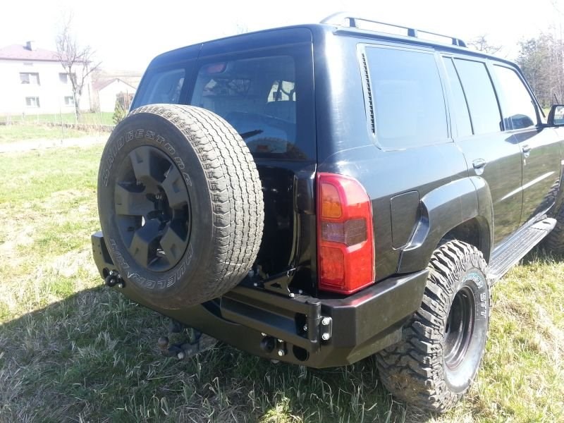 Ocelový držák rezervního kola pro Nissan Patrol Y60. Kvalitní zpracování. Dvojitá prášková barva. Vzhled totožný s obrázky (jako u Y61). Bez držáku hi-liftu.