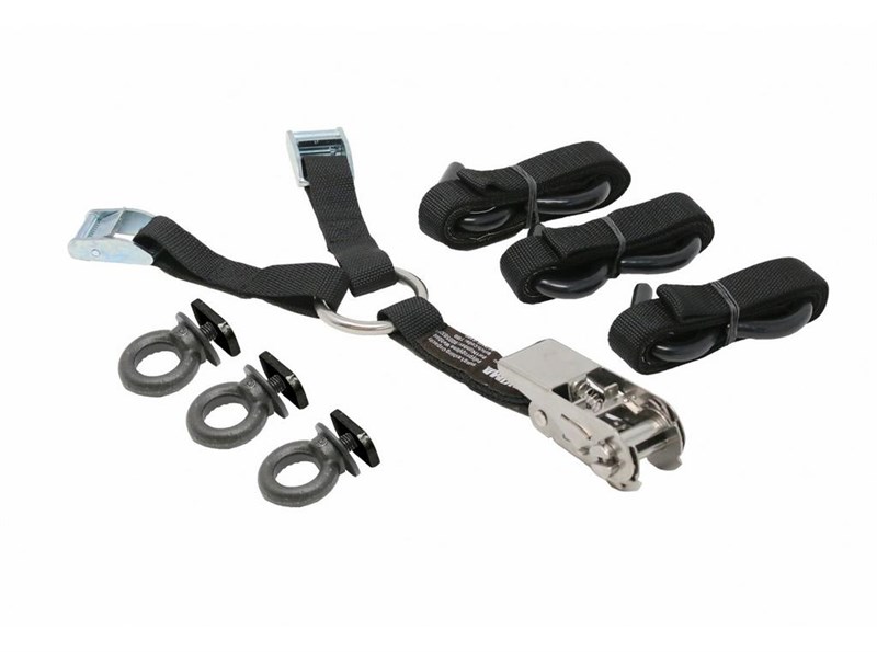 Obsahuje vše potřebné pro bezpečné uchycení pneumatiky ráčnou z nerezové oceli, odolné řemínky s háky a ocelové šrouby s okem, které slouží k rychlé instalaci do T-drážky na platformě.