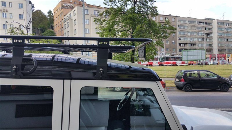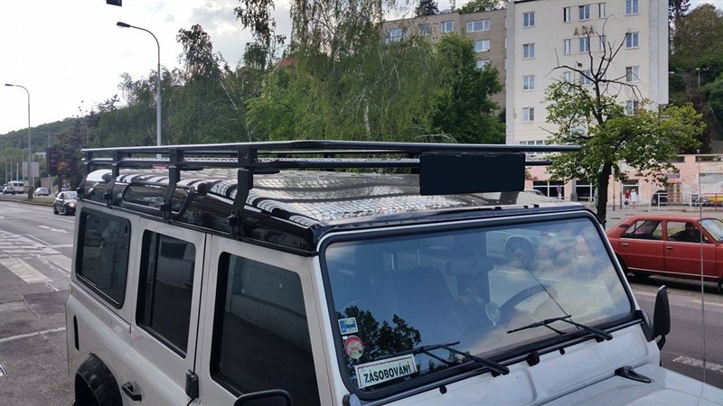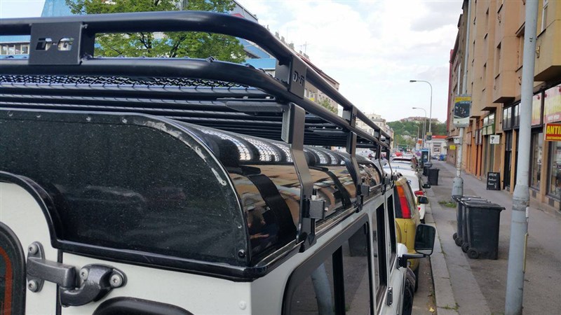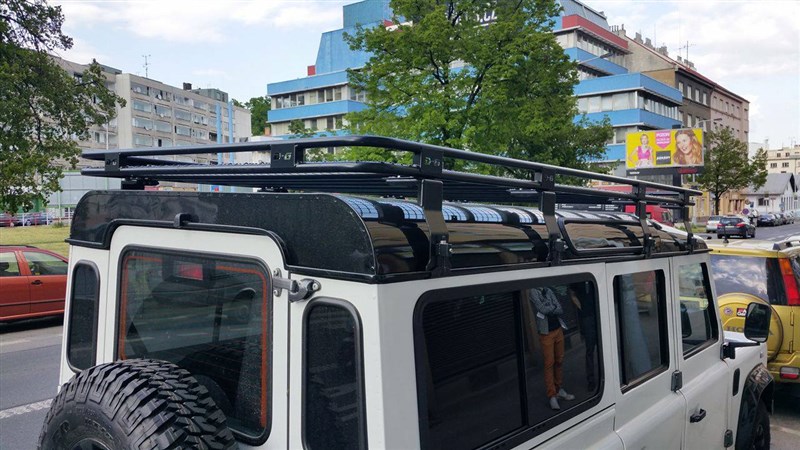 Expediční střešní nosič (zahrádka), určeno pro Land Rover Defender 110. Trubkování o průměru 25 mm, vzhled viz obrázek. Uchycení do okapnice střechy, včetně patek nosiče.