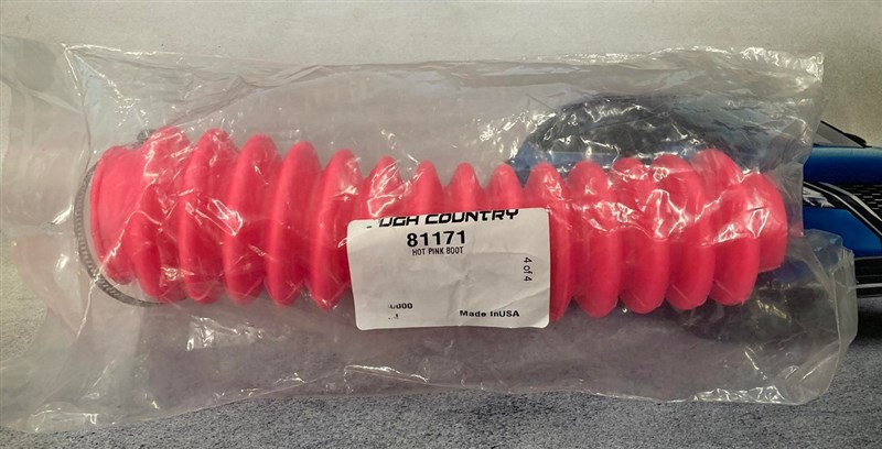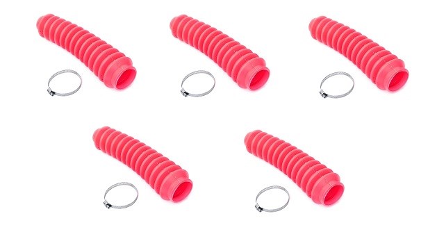 Sada pěti kusů univerzálních krycích gumových prachovek pro tlumiče (vhodné pro tlumič podvozku i řízení). Barva růžová (hot pink). Výrobce Rough Country (made in USA).