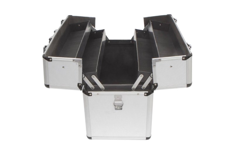 Nabízí dostatek místa pro malé součástky, např. šrouby, hmoždinky atd. Plastové přihrádky lze individuálně přizpůsobit. S vnitřním gumovým polstrováním. Na dně kufru se nacházejí nastavitelné přihrádky. Se dvěma třmínkovými zámky a zesílenými hranami a rohy, s popruhem.