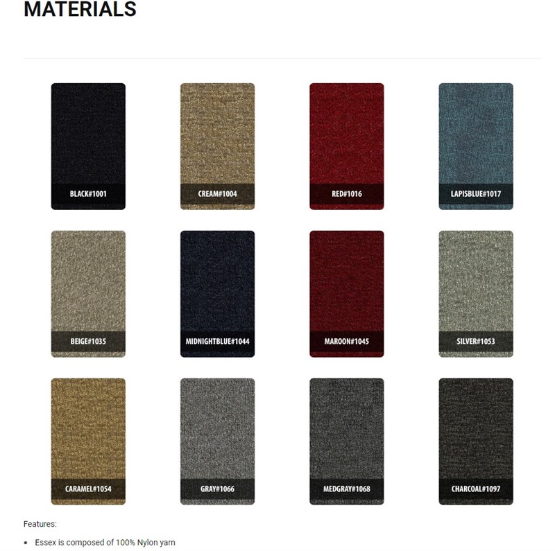 Kompletní sada koberců Essex s boční podporou od Auto Custom Carpets®. 5 kusů. Tento prvotřídní materiál Essex se skládá ze 100% nylonové příze. Essex obsahuje 22,5 unce příze na yard čtvereční (638g na 91,44 cm čtvereční), aby poskytoval bohatý vzhled a dojem. Jedná se o skvělou moderní verzi řezaného vlasového materiálu, kterou lze specifikovat téměř pro všechny modely vozidel. Essex je k dispozici s Mass Backing, která pomáhá vylepšit celkový vzhled vašeho koberce