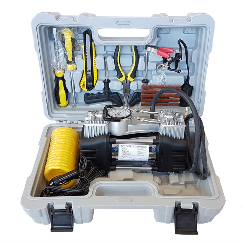 Ideální pro SUV. Doporučeno pro huštění pneumatik více než 31 palců i na dodávky (ATIS) Vlastnosti: - kompresor - vzduchový filtr -elastický kabel - připojení kabelů k baterii - kufr - sada nářadí - opravná sada lepení pneu.
