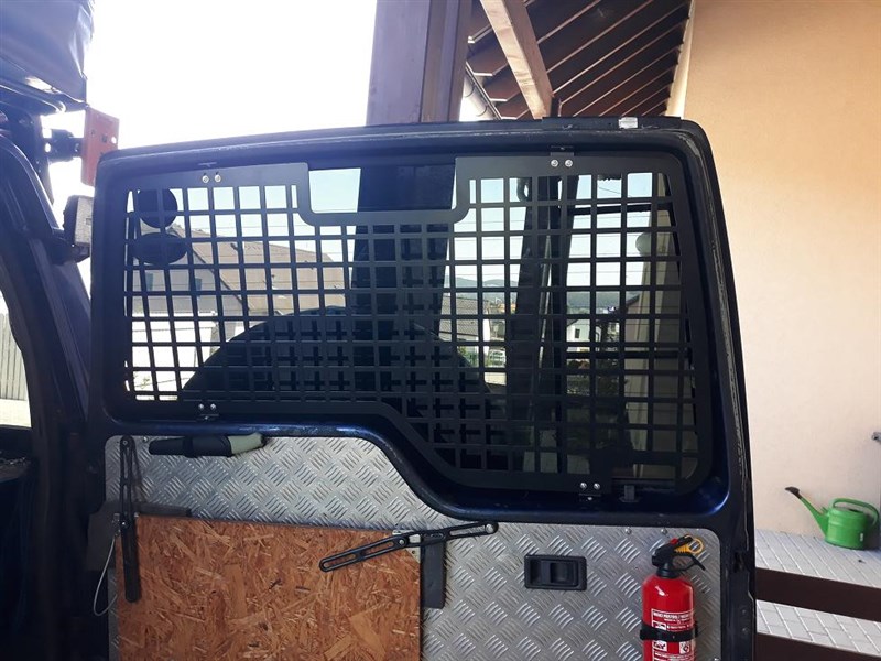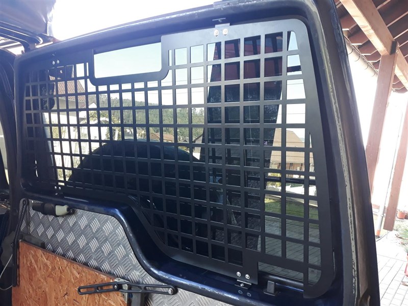 Ochranná mříž do zadního okna na pátých dveřích. Vhodné pro Land Rover Discovery 1 (1989-1998), Discovery 2 (1999-2004). Plech 3mm, černá prášková polomatná barva.