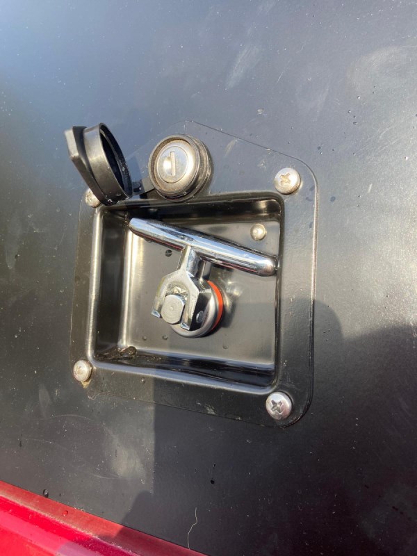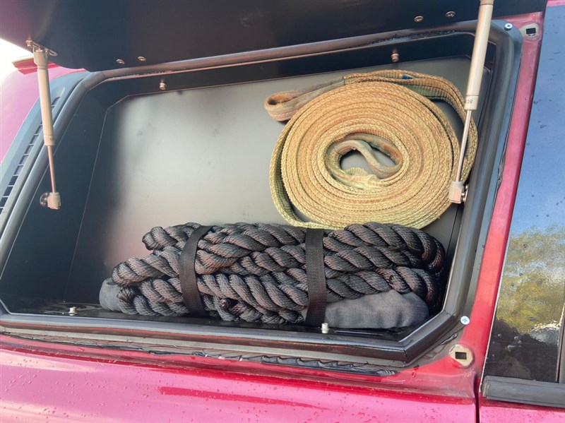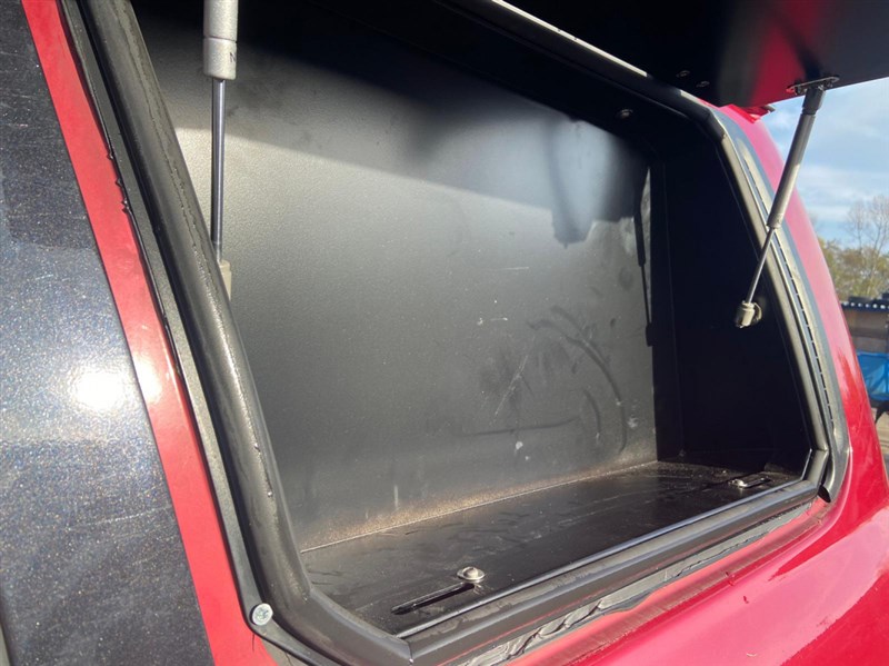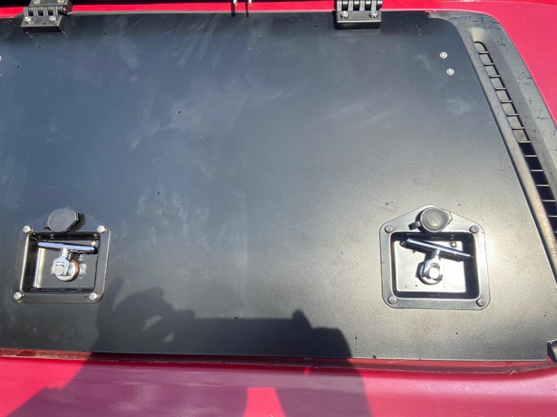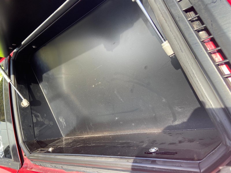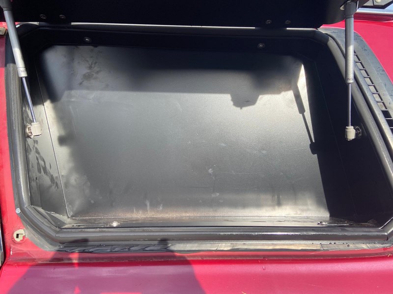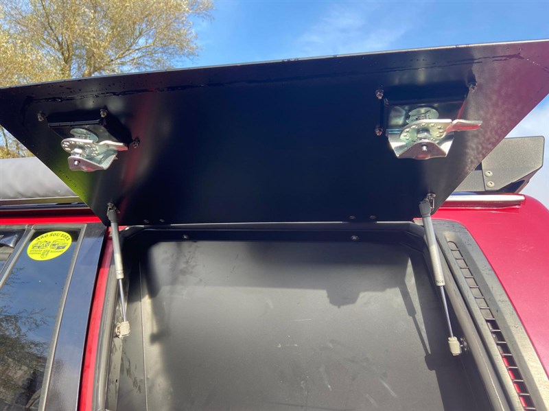 Okenní úložný box v okně kufru, velmi užitečný předmět, např. pro kurty a lana. Kovový rám, otevírací část je z hliníku, vše práškově lakováno. Zámek na klíč. Záda se dají odšroubovat. Interiér není čalouněný.
