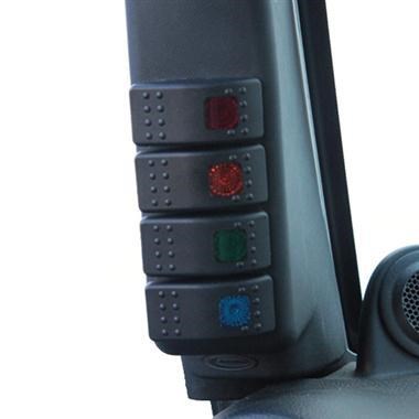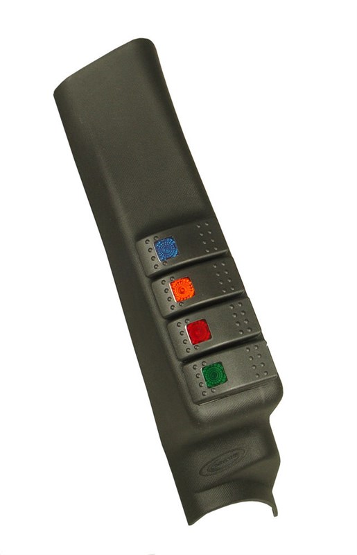 Panel se spínači na sloupek pro Jeep Wrangler JK, 2 i 4 dvéřová verze, rok výroby 2007-2010 (před faceliftem). Ideálně pasuje. Obsahuje 4 přepínače - modrý, zelený. oranžový, červený.