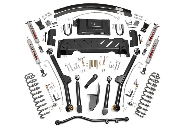 Podvozek Long Arm Rough Country Lift Kit Jeep Cherokee XJ 4,5" obsahuje vše pro zvednutí podvozku o +11,5cm. Tlumiče plněné dusíkem, přední vinuté pružiny a zadní přídavné  listy do originálních listových per. Včetně montážního materiálu a panhardky.