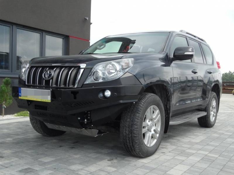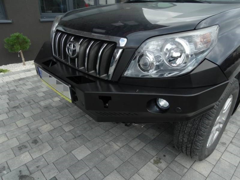 Přední pevnostní nárazník s plotnou pro naviják bez bullbaru, určený pro TOYOTA LAND CRUISER J150 09-13 . Hlavní konstrukce nárazníku je vyrobena z plechu o tloušťce 3 mm až 6 mm . Produkt je nejprve řezán laserem, pak ohnut na CNC ohraňovacím lisu a správný tvar je získán ručním dokončováním . Dalším krokem je zajištění antikorozní ochrany, jejichž součástí je žárové zinkování a prášková barva , která dává konečný vzhled nárazníku.