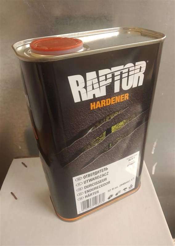Tvrdidlo pro barvu Raptor - Raptor Hardener. Obsah balení 946ml (pro jednu láhev barvy Raptor se běžně dává cca 237ml). Jedná se pouze o tvrdidlo, ne o barvu.