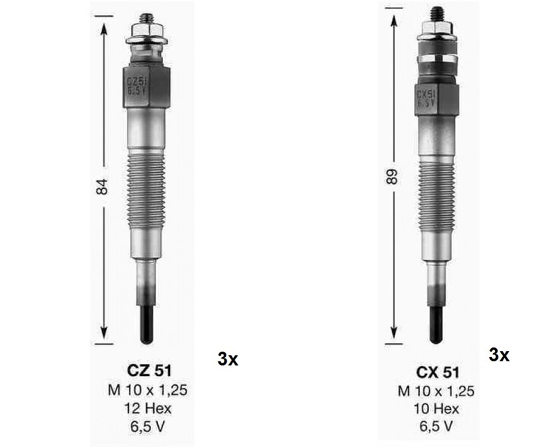 Sada 6ks žhavících svíček NGK na Nissan Patrol Y60 2.8TD. Tři kusy svíček jsou na válec 1,2,3 a tři kusy na válec 4,5,6. OE: 11065V7202, 11065V7203.