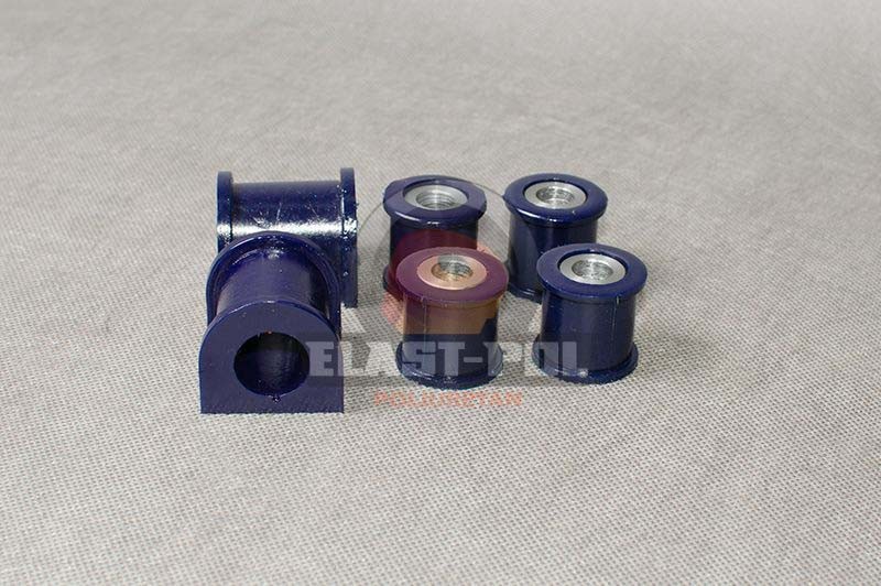 Silenbloky stabilizatoru Suzuki Samurai. Polyuretan je materiál 10 krát odolnější než guma. Použití polyuretanových komponent umožňuje nastavit auto na nejtěžší úkoly.