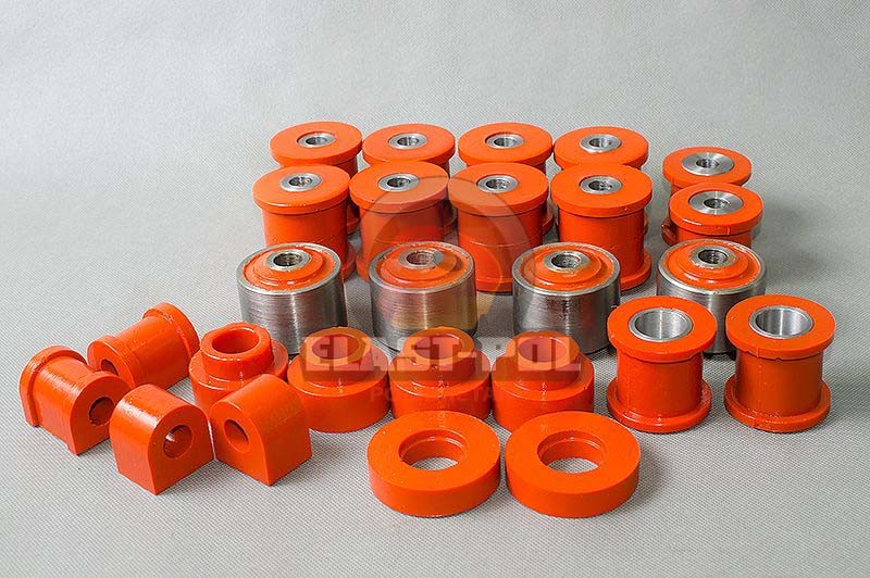 Pouzdra PUR Nissan Patrol Y60/61. Polyuretan je materiál 10 krát odolnější než guma. Použití polyuretanových komponent umožňuje nastavit auto na nejtěžší úkoly. Pro motorizace 2.8TD.