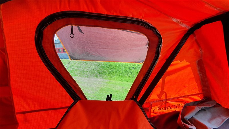 - flysheet - nepromokavý 420 D polyester, natažený tak, že zaručuje proudění vzduchu mezi flysheetem a střechou stanu.
