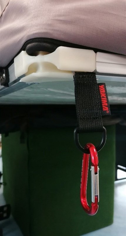 K zavěšení se používá karabina, která je uchycená na silném nylonovém řemínku. Ten se jednoduše zasune do plastového otvoru v rohu spodní konstrukce a posouvá po kolejničce po obvodu stanu na potřebné místo.