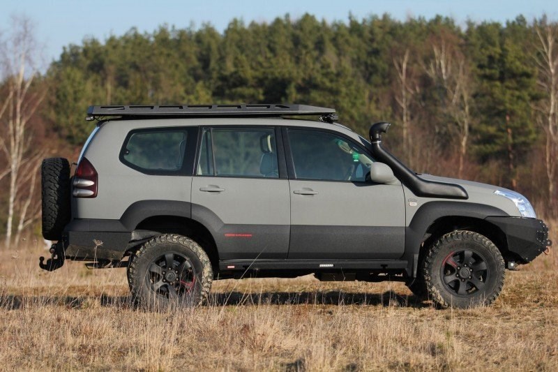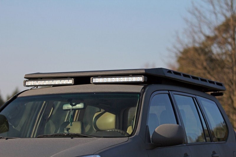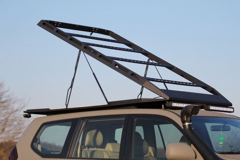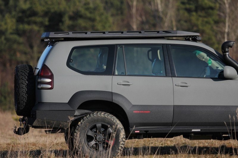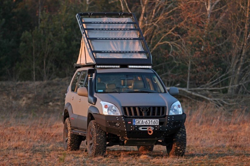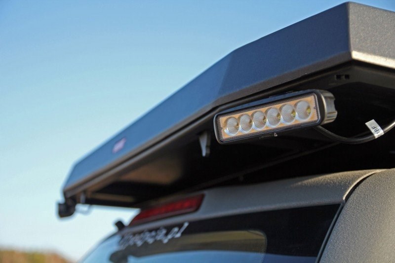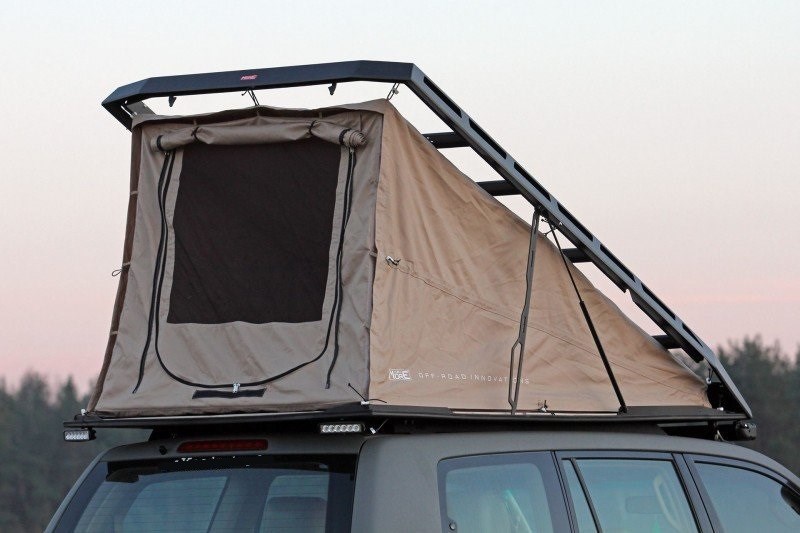 Kompaktní ocelový střešní nosič se skrytým střešním stanem, který dokonale zapadá do střechy terénního vozidla a nevyčnívá nad její obrysy.
