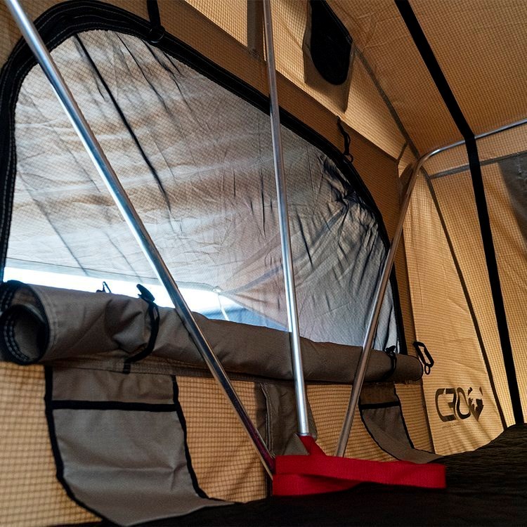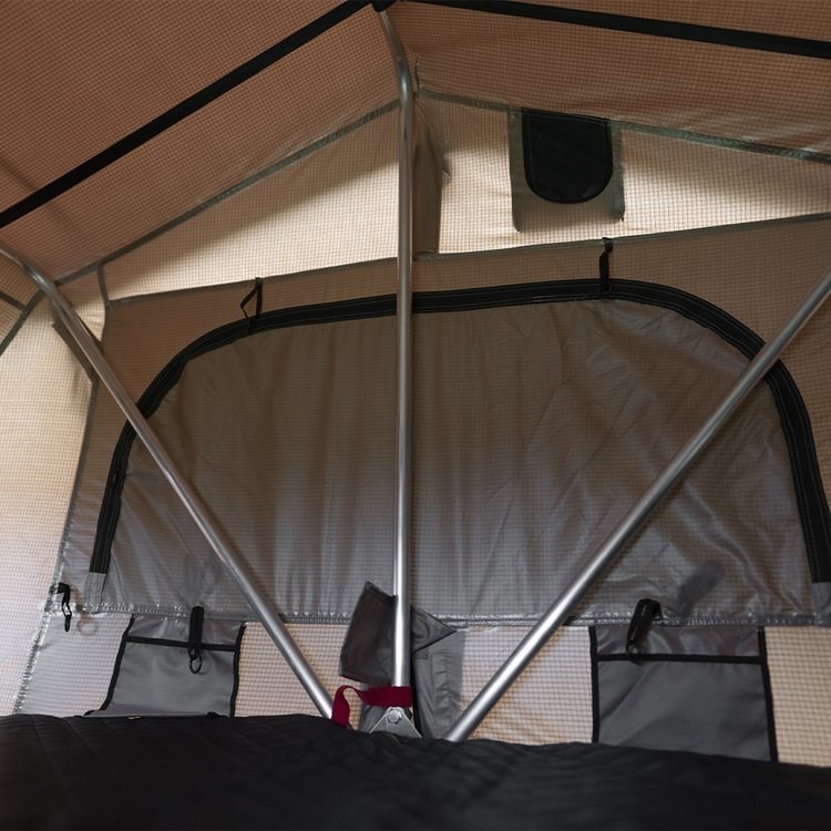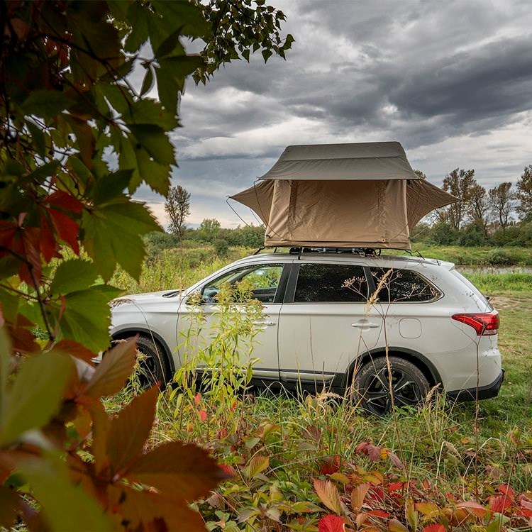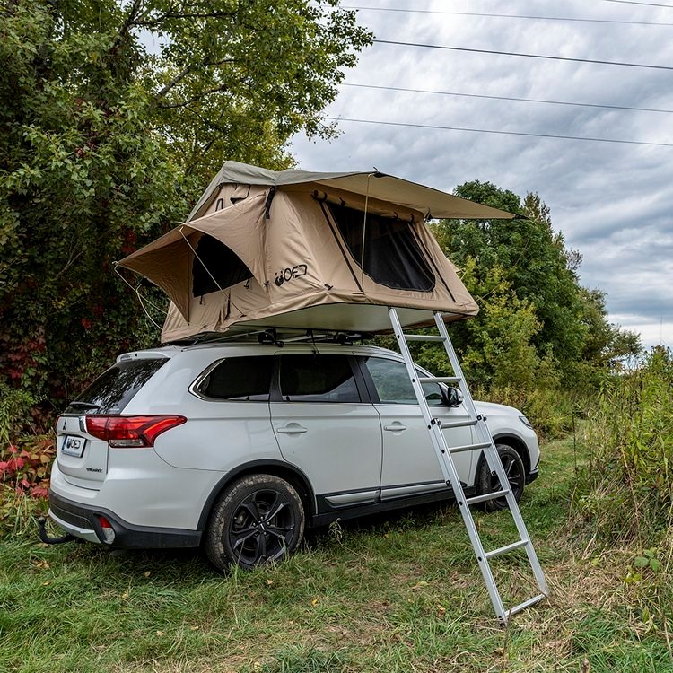 Vyberte si stan z OFD, ve kterém je vchod a všechna okna vybavena otevřenými moskytiérami . Okna lze navíc zakrýt proti dešti. Pevný hliníkový žebřík je oporou našeho střešního stanu a lze jej snadno nastavit na výšku vašeho vozu. Kryt stanu v černém provedení je připevněn silným suchým zipem a třemi pásky. Podlaha je vyrobena z vícevrstvého izolačního materiálu (typ sandwitch) a je namontována na rámu.