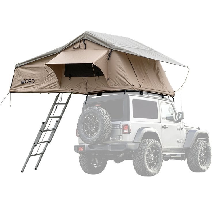 Vyberte si stan z OFD, ve kterém je vchod a všechna okna vybavena otevřenými moskytiérami . Okna lze navíc zakrýt proti dešti. Pevný hliníkový žebřík je oporou našeho střešního stanu a lze jej snadno nastavit na výšku vašeho vozu. Kryt stanu v černém provedení je připevněn silným suchým zipem a třemi pásky. Podlaha je vyrobena z vícevrstvého izolačního materiálu (typ sandwitch) a je namontována na rámu.