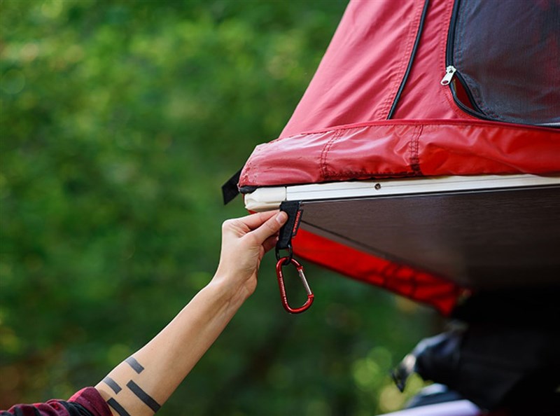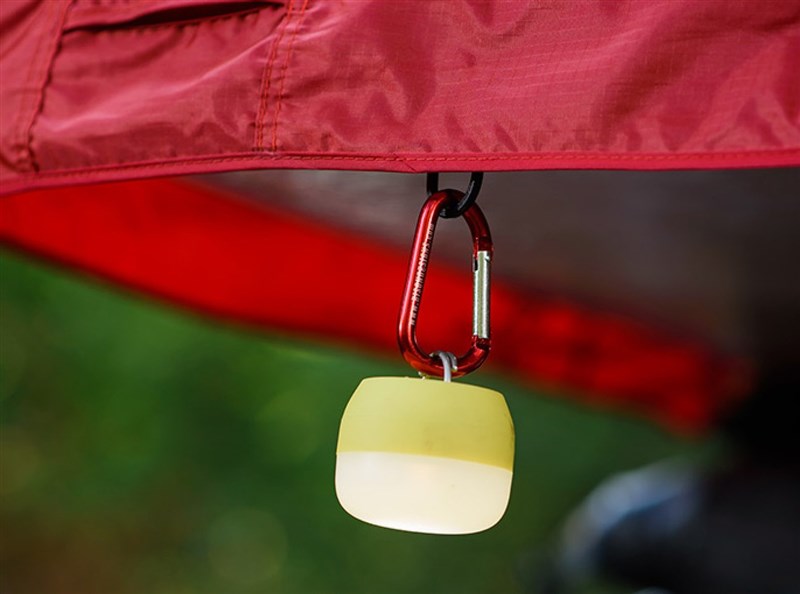 Karabiny Yakima SkyHooks k zavěšení doplňků (svítilny, batohu, ručníku, bundy,...).