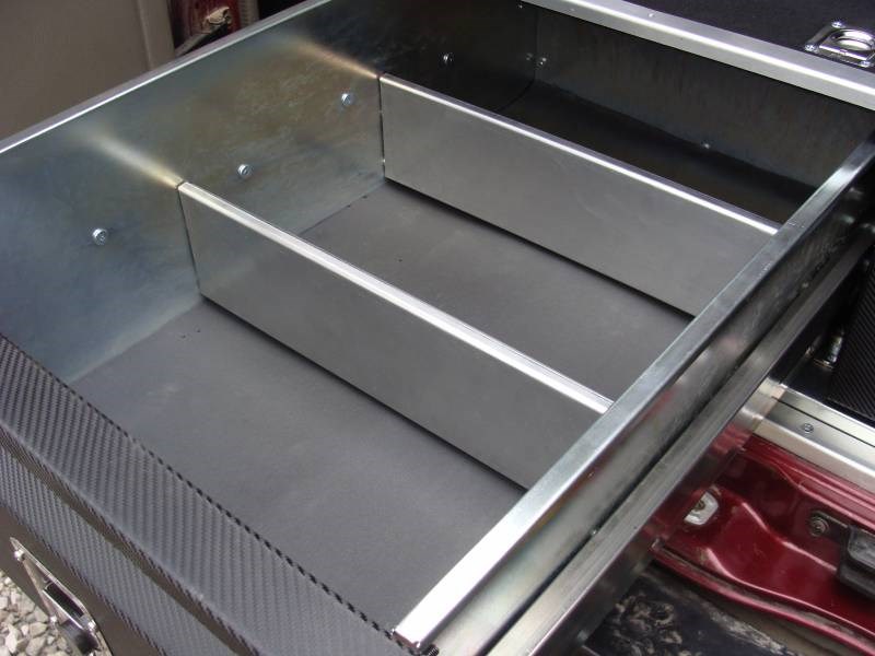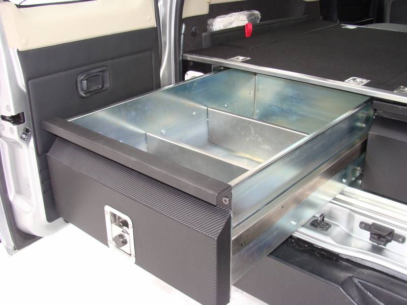 Nosná konstrukce stejně jako zásuvky jsou vyrobeny z ocelového plechu, který je pozinkovaný, což je velmi dobrá ochrana proti korozi. Otevírací mechanismus se skládá ze zásuvky (šuplíku) z nerezové oceli s vodícími lištami a ložisky v horní i dolní části. Tato konstrukce odstraňuje vůle mezi zásuvkou a nosnou konstrukci, poskytuje vysokou spolehlivost a odstraňuje vrzání za jízdy. Každá zásuvka je vybavena dvěma přihrádkami. Čela jsou pokryty fólií z uhlíkových vláken, což dává celému systému sportovní vzhled a chrání před škrábanci z provozu. Obě zásuvky jsou vybaveny robustními nerezovými zámky, které mohou být uzamčeny pomocí klíče. Horní část je vyrobena z překližky pokryté látkou a hliníkovými lištami, které kryjí hrany, což pěkně ladí s interiérem vozu. Systém je vybavena osmi úchyty (oky), které umožňují ochranu proti pohybujících se předmětů, jako jsou ledničky atd.